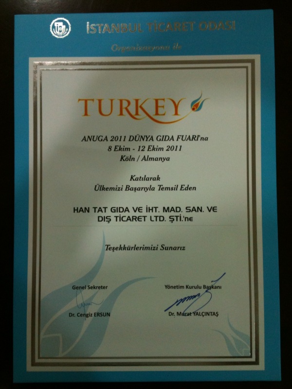 8 Ekim – 12 Ekim 2011 Tarihlerinde Köln/ Almanya da düzenlenen Anuga 2011 Dünya Gıda Fuarında yoğun ilgi gören standımızda ürünlerimizi bir kez daha Dünyanın beğenisine sunduk. Fuar boyunca özveri ile Türkiye’nin lezzetlerini Tüm Dünyadan gelen katılımcılara tattırma fırsatı bulduk.